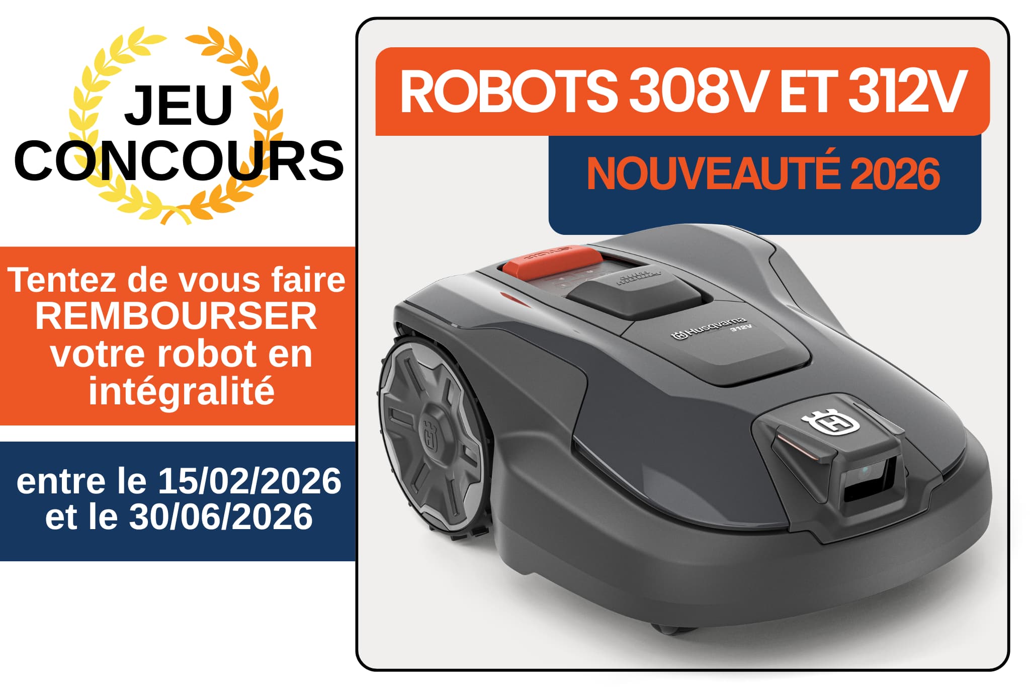 Pour tout achat d'un robot Husqvarna AM308V ou AM312V entre le 15 février et le 30 juin 2026 (hors lease), tentez de vous faire rembourse votre robot.