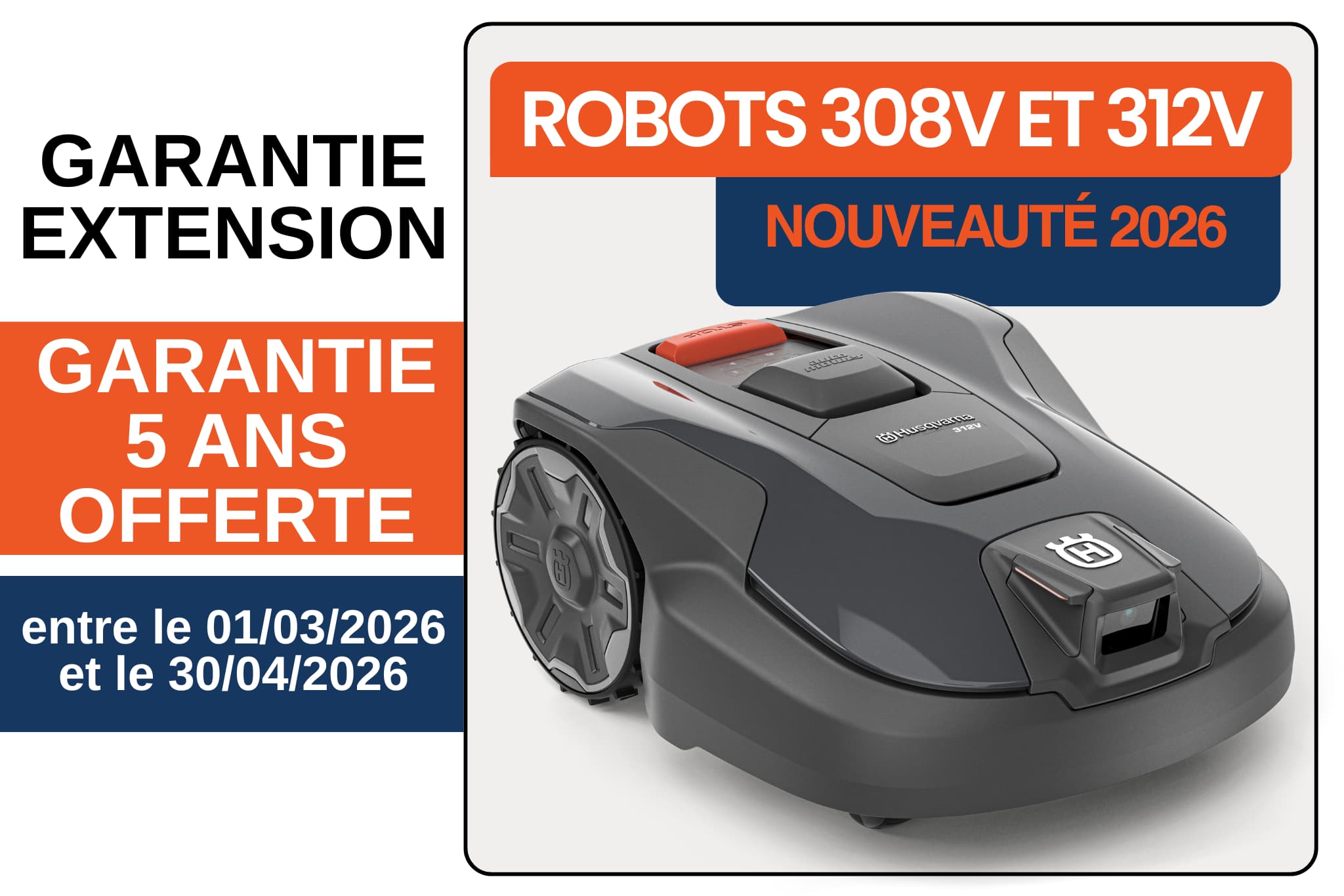 Extension de garantie 3 +2 ans pour tout achat d'un robot Husqvarna AM308v ou AM312V du 01 mars au 30 avril 2026 :